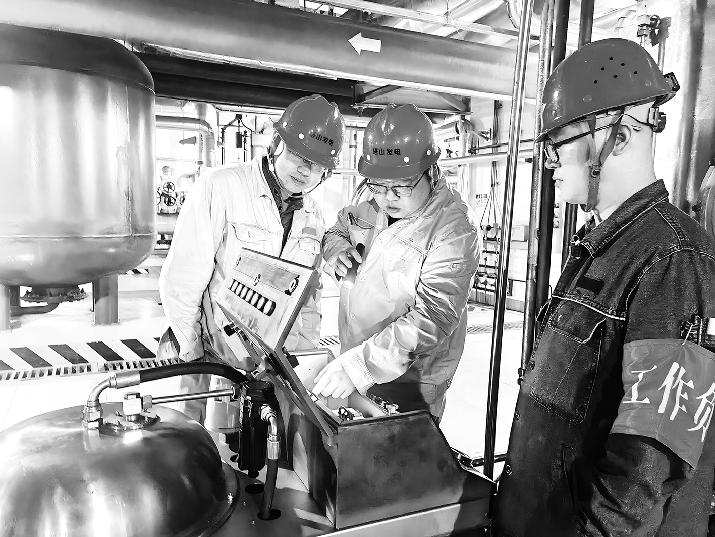 晋控电力塔山发电公司以系统设备春检为契机,将计划性检修和日常管理维护紧密结合,严格落实各项防范措施,全力夯实安全工作基础,实现安全生产“零事故”。图为设备部汽机和电气点检人员共同检查1号机组汽机抗燃油箱电路。 赵前卫摄